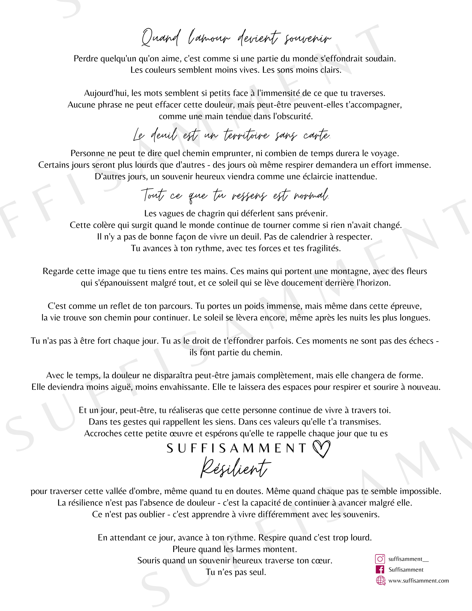 Chaque œuvre est conçue pour être accrochée et te murmurer quotidiennement: "Tu es SUFFISAMMENT aimé. Tu es SUFFISAMMENT résilient. Tu en fais SUFFISAMMENT."