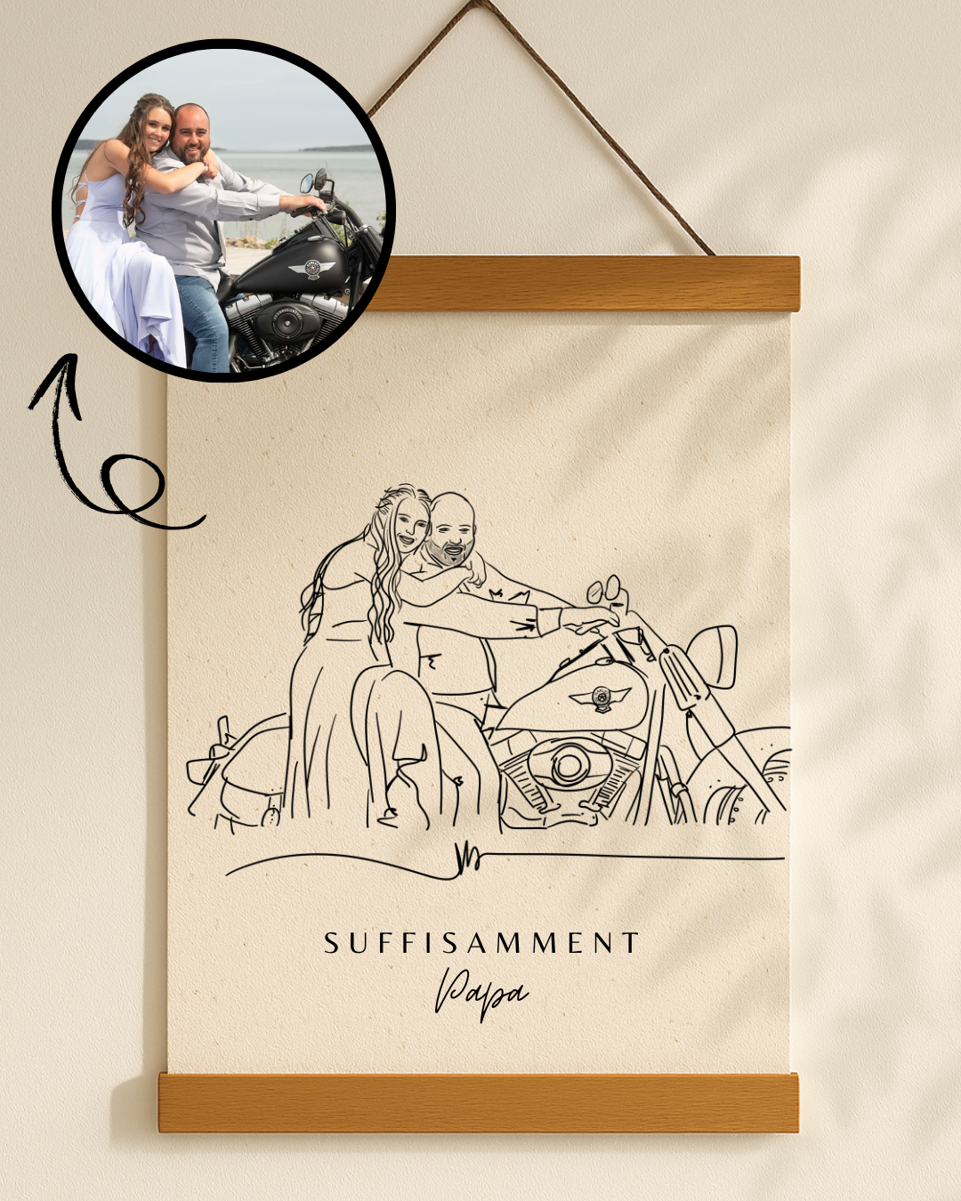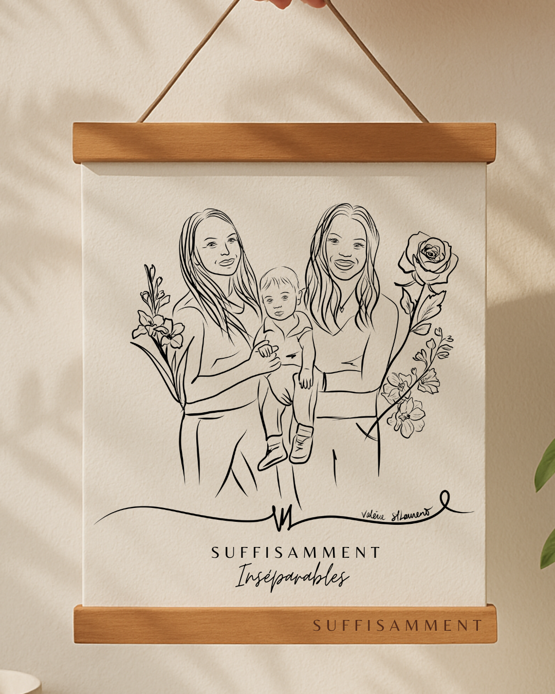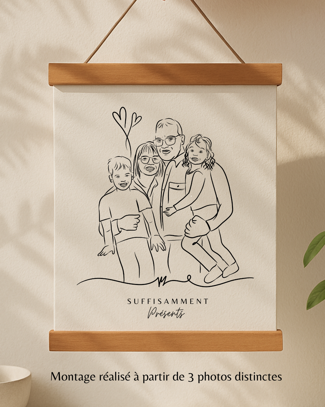 Tu peux ajouter une copie du portrait pour 47$ à ton panier. Chaque copie vient avec le cadre en bois minimaliste.