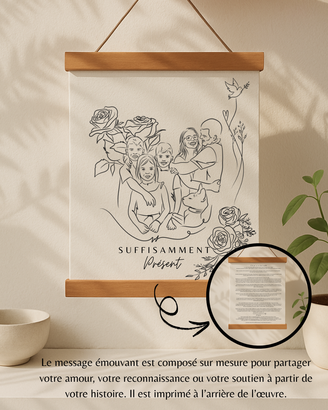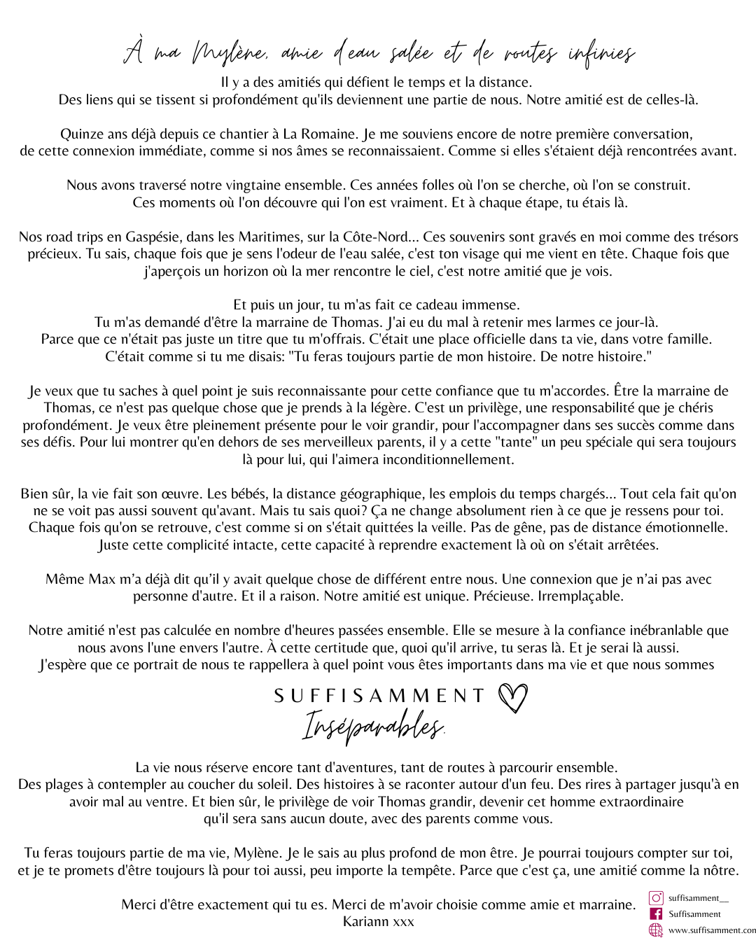 Tu me partages une photo précieuse ou quelques photos pour que je puisse ceux qui compte ensemble. Tu me racontes votre histoire. Ces anecdotes que tu chéris, ces surnoms qui n'appartiennent qu'à vous, ces moments précieux qui définissent une relation... Je les transforme en une oeuvre minimaliste et rédige un texte qui touche l'âme.